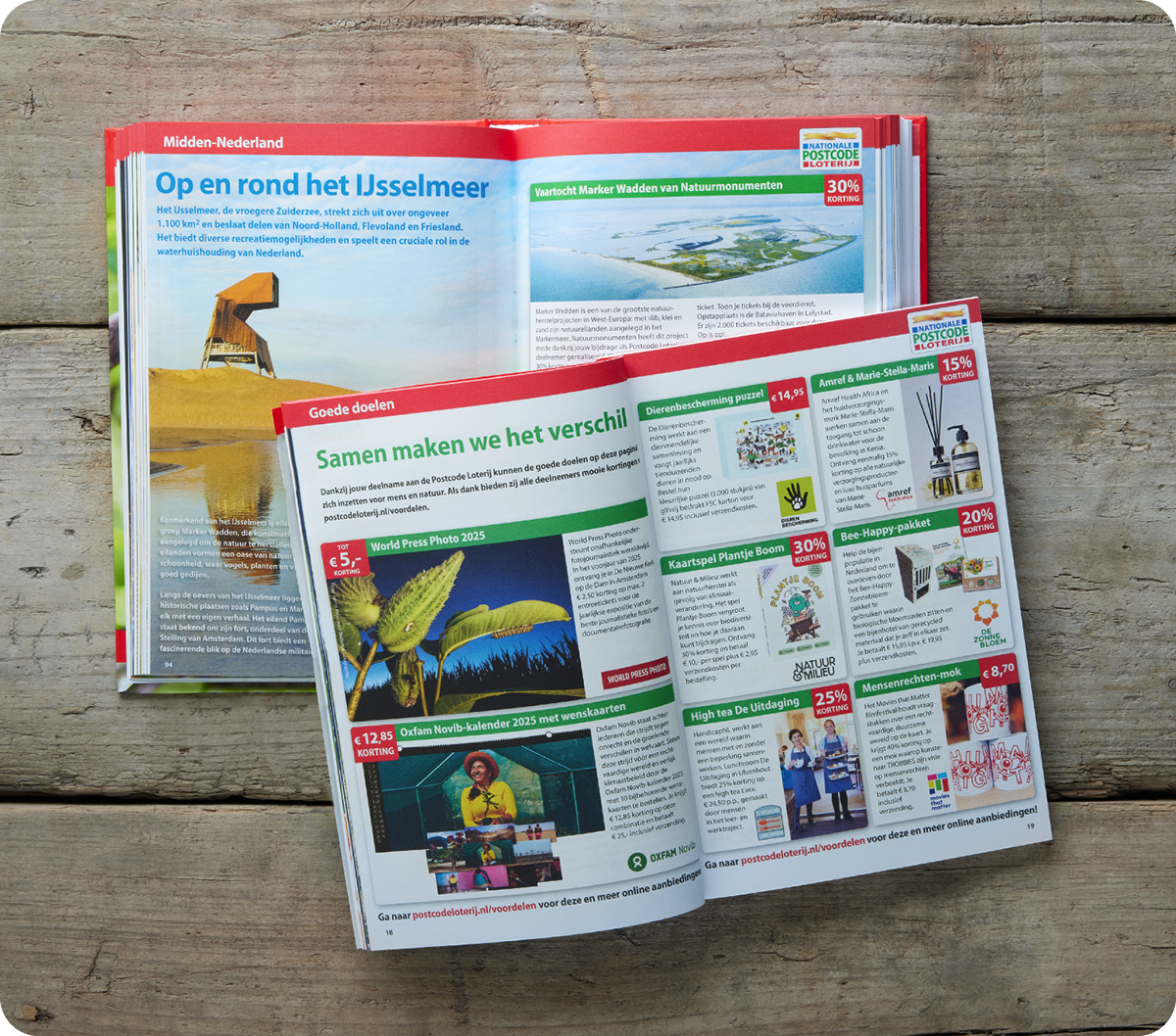 Een dagje ontspannen in de sauna, een museum bezoeken of een excursie in de natuur. Door alle aanbiedingen, speciaal samengesteld voor de deelnemers, is de Postcode Loterij Voordeelagenda nog altijd populair. De agenda is half november 2023 thuisbezorgd bij de deelnemers die deze willen ontvangen. De overige deelnemers krijgen de Voordeelgids eind 2023 op de deurmat of ze vinden hun voordelen online. Zo kunnen deelnemers in 2024 weer volop genieten van uitstapjes en producten met korting. De agenda en gids bevatten in totaal 5.000 euro aan voordeel.